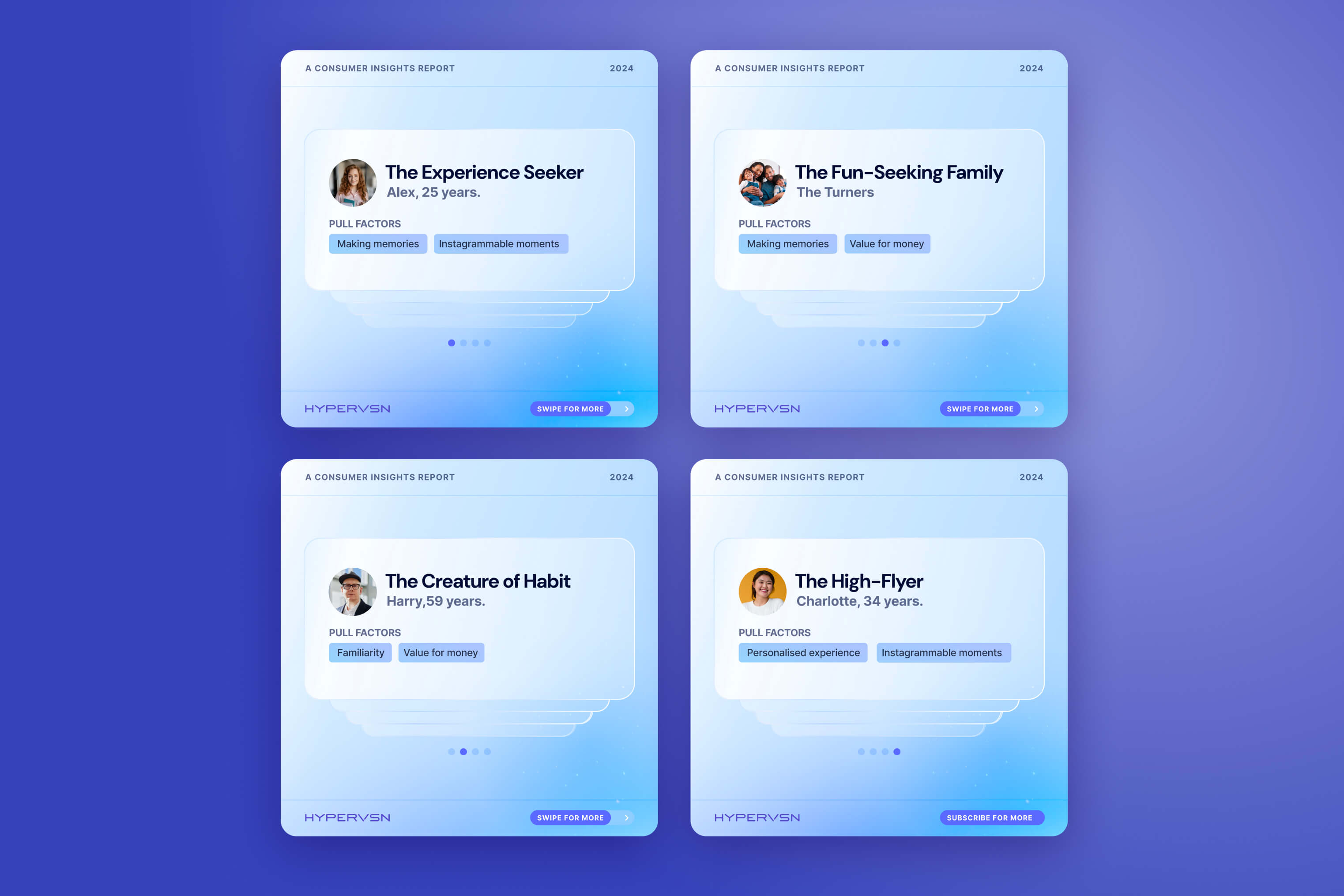 Designed a series of persona profile cards to humanize consumer research data and drive report engagement across LinkedIn, Instagram, and Facebook. Each card humanizes consumer segments, helping B2B audiences recognize their own customers.